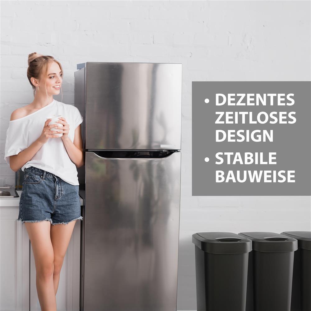 • Praktischer Klappschwingdeckel: Ein sanftes Drücken oder Anheben, und der Schwingdeckel öffnet sich wie von selbst in beide Richtungen. Das macht die Müllentsorgung von Restmüll, Plastikmüll oder Papiermüll sehr flexibel und komfortabel.