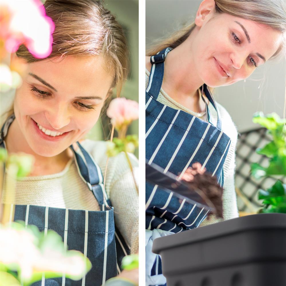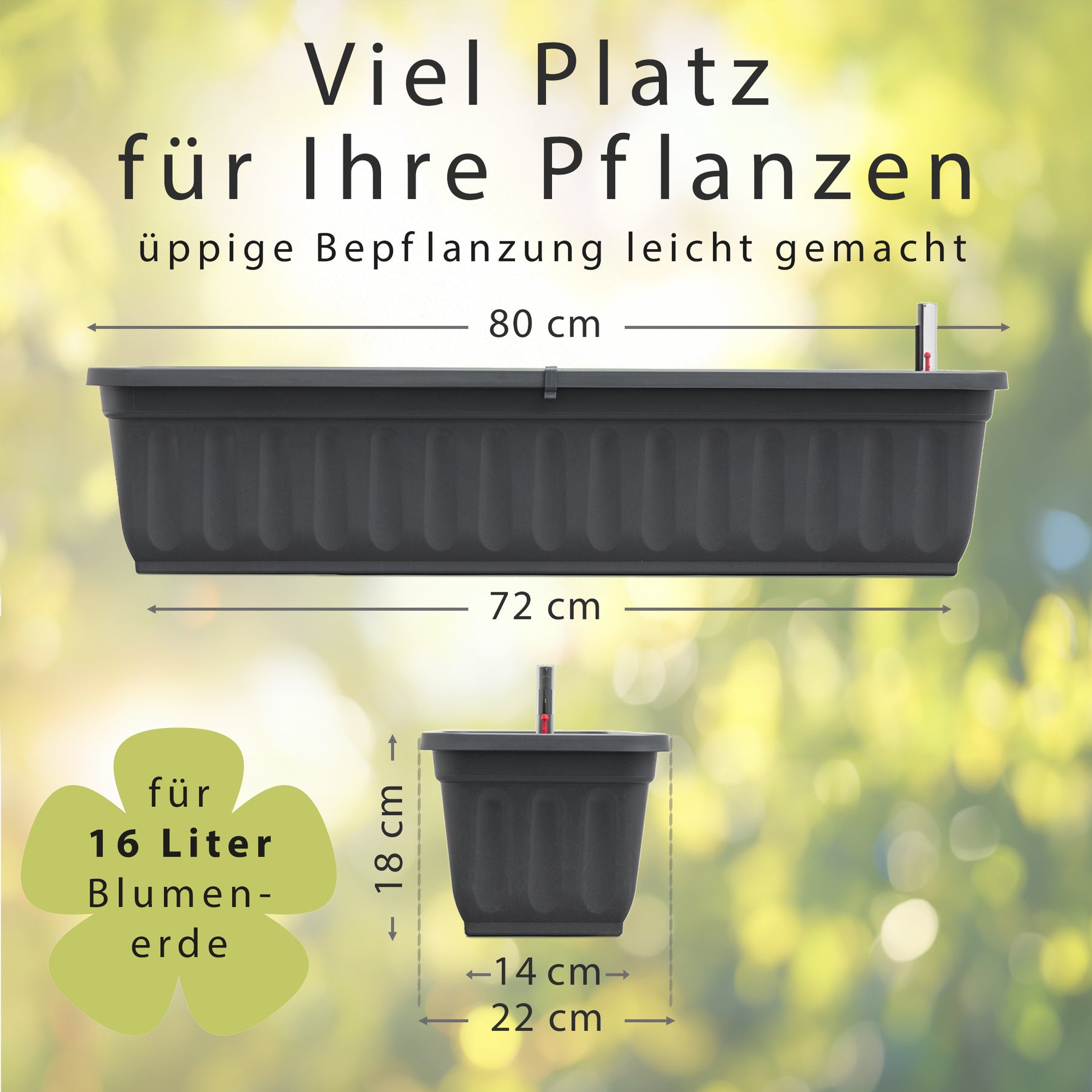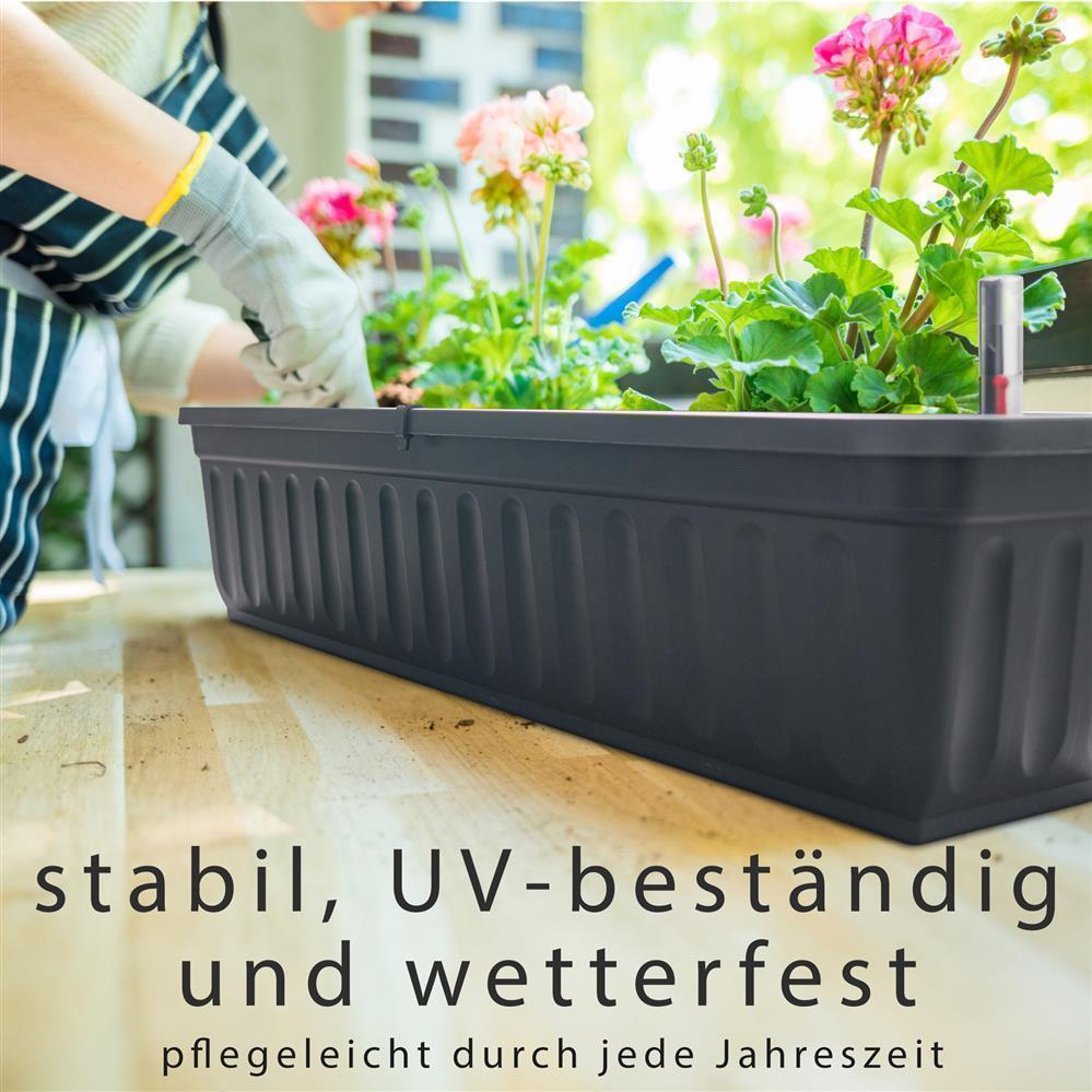 Cleveres Bewässerungssystem - der Natur nachempfunden:Unser Balkonkasten ist mit einem herausnehmbaren Hydroeinsatz ausgestattet. Der integrierte Wassertank versorgt die Pflanzen kontinuierlich mit Feuchtigkeit, während der Wasserstandsanzeiger präzise Informationen über den Wasserpegel liefert.