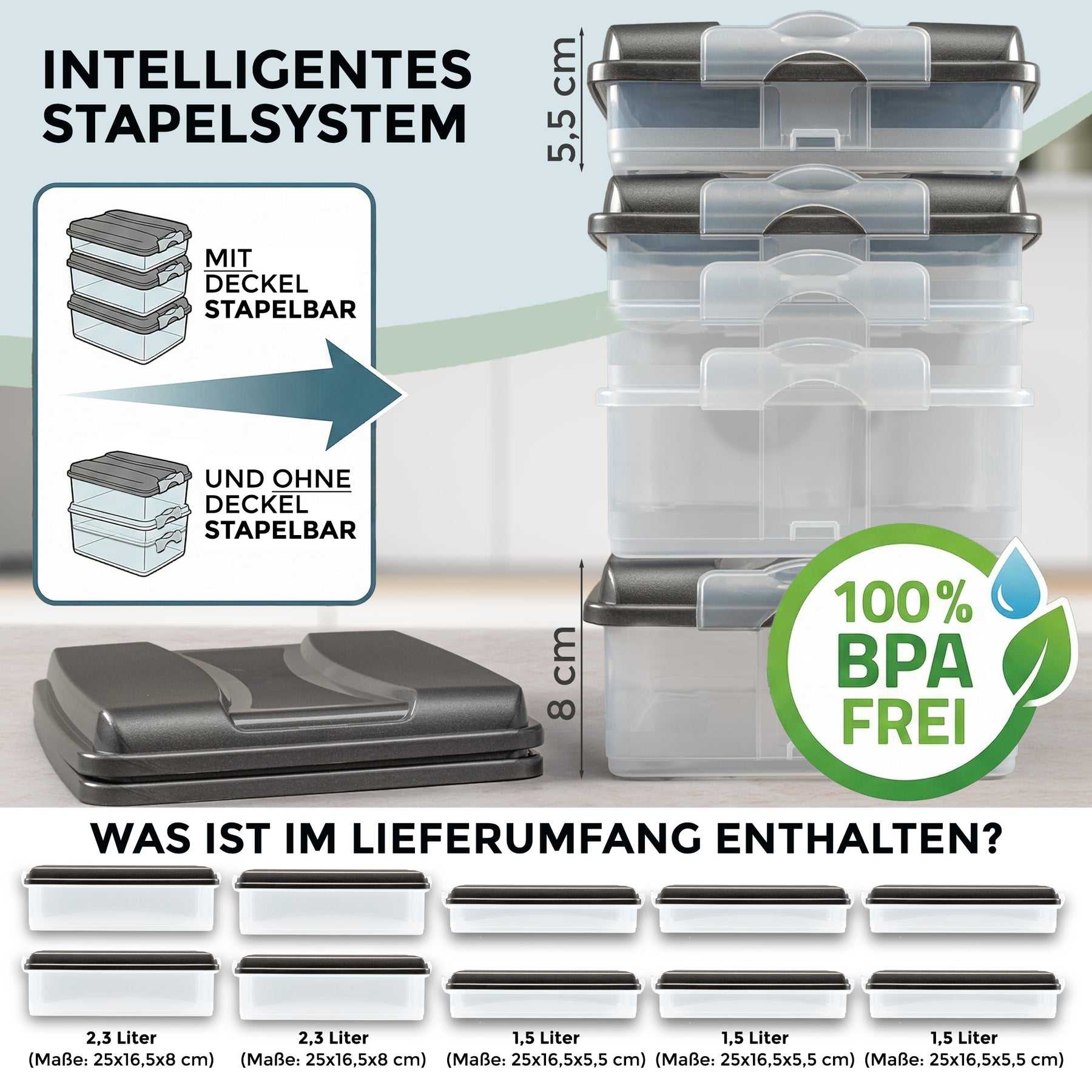 Lieferumfang: 6 x Aufschnittdose flach, 4 x Aufschnittdose hoch, 10 x Deckel in Anthrazit.